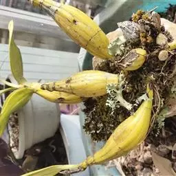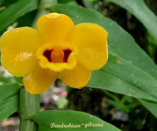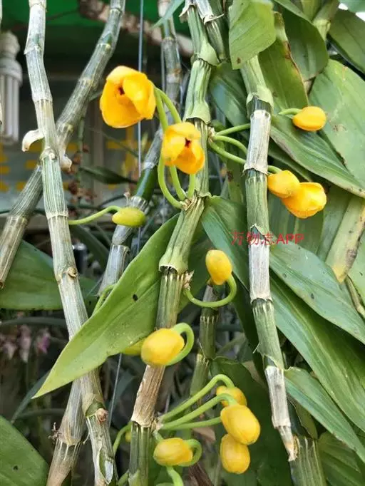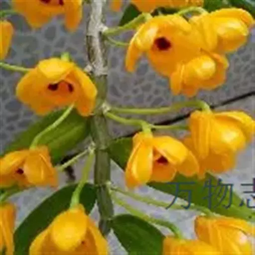 束花石斛(学名:Dendrobium chrysanthum Lindl.):茎粗厚,肉质,下垂或弯垂,圆柱形,不分枝,具多节。叶二列,互生于整个茎上,纸质,长圆状披针形。伞状花序近无花序柄,每2-6花为一束,侧生于具叶的茎上部;花黄色,质地厚;花瓣稍凹的倒卵形,长16-22毫米,宽11-14毫米,先端圆形,全缘或有时具细啮蚀状,具7条脉;唇瓣凹的,不裂,肾形或横长圆形。蒴果长圆柱形,花期9-10月。
