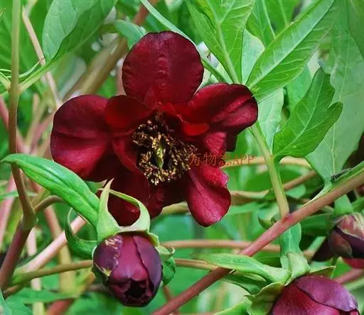 亚灌木,全体无毛。茎高1.5米,当年生小枝草质,小枝基部具数枚鳞片 。叶为二回三出复叶;叶片轮廓为宽卵形或卵形,长15~20厘米,羽状分裂,裂片披针形至长圆状披针形,宽0.7~2厘米;叶柄长4~8.5厘米。花2~5朵,生枝顶和叶腋,直径6~8厘米;苞片3~4(~6),披针形,大小不等;萼片3~4,宽卵形,大小不等;花瓣9(~12),红色、红紫色,倒卵形,长3~4厘米,宽1.5~2.5厘米;雄蕊长0.8~1.2厘米,花丝长5~7毫米,干时紫色;花盘肉质,包住心皮基部,顶端裂片三角形或钝圆;心皮2~5,无毛。瞢葖长约3~3.5厘米,直径1.2~2厘米。花期5月;果期7~8月。