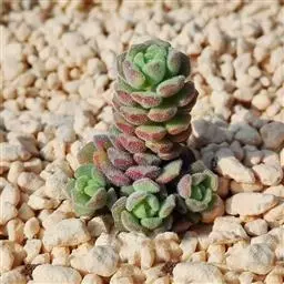小型多肉品种。有茎,叶互生,排列成莲座状,匙形,表面光洁,正面平坦,背面隆起,肉质厚实,翠绿色,或嫩绿色,叶面上被白粉,有纵向暗纹,并透出密布的极细微的白色颗粒,犹如凝冻的脂肪,经充足的阳光照射,叶尖会出现美丽可爱的小红点。常从茎的下部生出新芽,形成群生状。春季开出成簇小花,白色,花药紫色。据说植株经太阳晒过后,会散发淡淡的香味,故有人叫它“香石莲”。