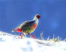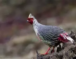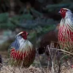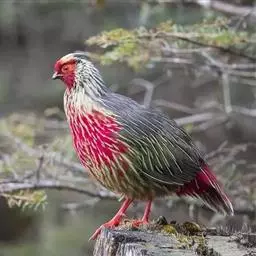 血雉雉科血雉属鸟类,别名血鸡、松花鸡,血雉的雄鸟大覆羽、尾下覆羽、尾上覆羽、脚、头侧、腊膜为红色,…