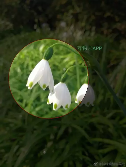 鳞茎卵圆形,直径2.5-3.5厘米。基生叶数枚,绿色,宽线形,长30-50厘米,宽1-1.5厘米,钝头。花茎与基生叶同时抽出,中空,略高于叶或与叶近等长;伞形花序有花3至数朵,有时仅1朵,下有佛焰苞状总苞片1枚,长3-4厘米,宽5-10毫米;花梗长短不一,长者约有5厘米,短者仅1-2厘米;花下垂;花被片长约1.5厘米,白色,顶端有绿点;雄蕊长约为花被片的一半;子房下位,长椭圆形,长5-10毫米;花柱长于雄蕊。蒴果近球形,直径约2厘米;种子黑色。花期春季。