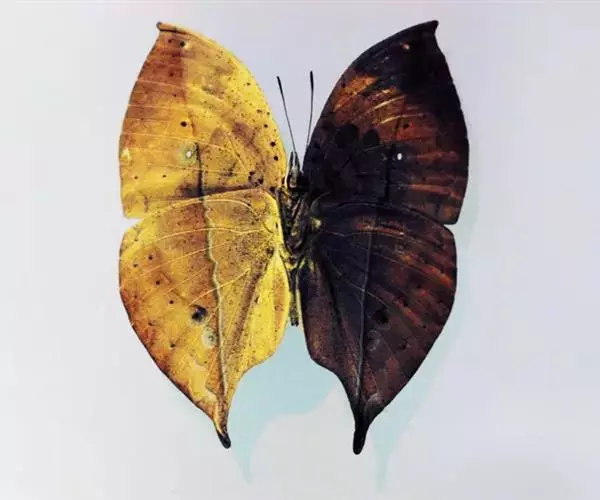 大型蝴蝶,翅展85-110毫米,前翅长42-45毫米。以前后翅相叠其翅形及斑纹似枯叶而著称。前后翅均略呈半椭圆形,翅顶张出一尖突斜向外侧,后翅后缘与外缘间延伸出一向后的尖突,这2个尖突的变化颇显著。翅的背面闪深蓝色、紫蓝色或淡蓝色光泽,依季节不同而异。前翅从前缘中部到后角,有一宽的桔黄色斜带,CuA1室中央有一黑色圆纹,其中心有一白点,R4室内有一白色斑点;外缘内侧有一黑色波状细线。后翅外缘内侧也有黑色波状细线,R3、M1、M2、M3室内有时具一圆形暗色纹。翅的腹面呈枯叶色,静息时从前翅顶角到后翅臀角处有1条深褐色的横线,加上几条斜线,酷似叶脉;其色彩变化多,黄褐色、褐色、红褐色均有;有的色彩均匀,有的散布大小不规则的枯黄色、苔绿色斑纹及小点;CuA1,斑甚明显,其中心椭圆斑半透明,像昆虫蛀蚀的孔。由前翅顶角内侧到后缘中央和后翅前缘中央至后缘尾突处各有1条深色直条纹,2翅相叠时,前后翅深色直纹相连,仿佛是叶片的中脉。