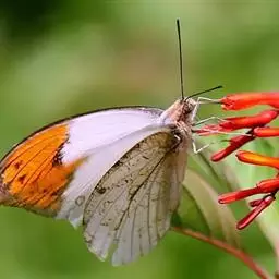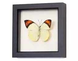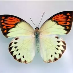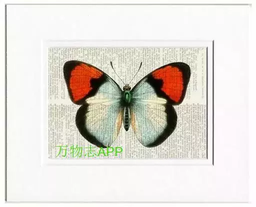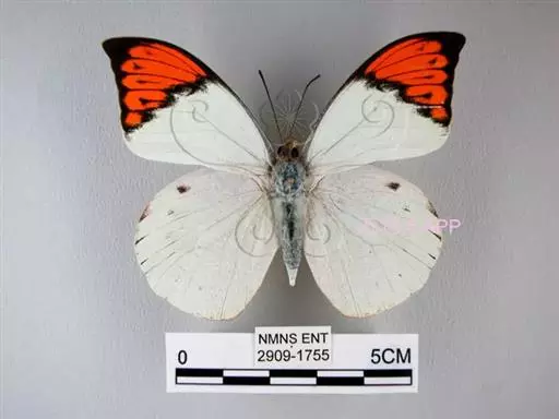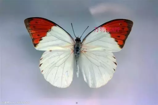 成虫:雄蝶翅白色,前翅前缘及外缘黑色,自前缘1/2处至外缘近后角处有黑色锯齿状斜纹,围住顶部三角形赤橙色斑,斑被黑色脉纹分割;室内有1列黑色箭头纹;后翅外缘脉端有黑箭头纹。雌蝶黄白色,散布有黑色鳞粉,后翅外缘、亚缘各有1列明显的黑色箭头纹。反面前翅端半部和整个后翅满布褐色细纹。春型个体小,翅稍尖。