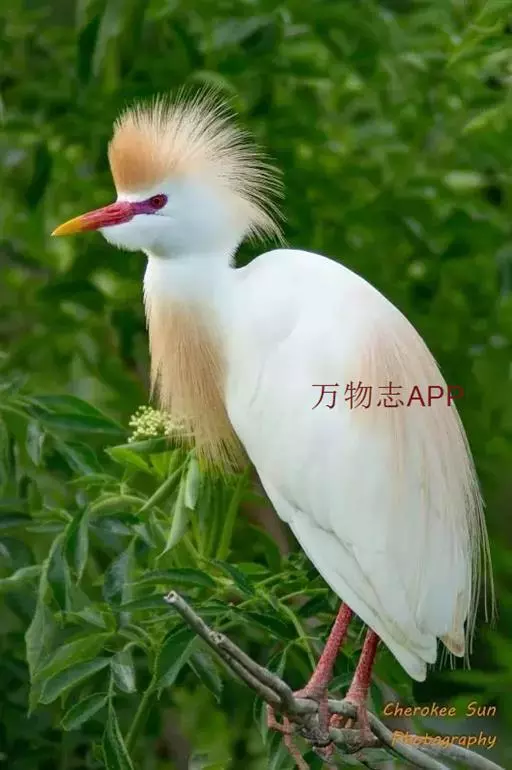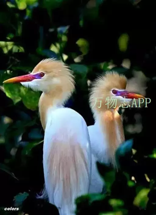 牛背鹭(学名:Bubulcus ibis):体较肥胖,喙和颈较短粗。夏羽大都白色;头和颈橙黄色,前颈基部和背中央具羽枝分散成发状的橙黄色长形饰羽;前颈饰羽长达胸部,背部饰羽向后长达尾部,尾和其余体羽白色。冬羽通体全白色,个别头顶缀有黄色,无发丝状饰羽。