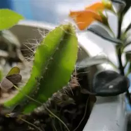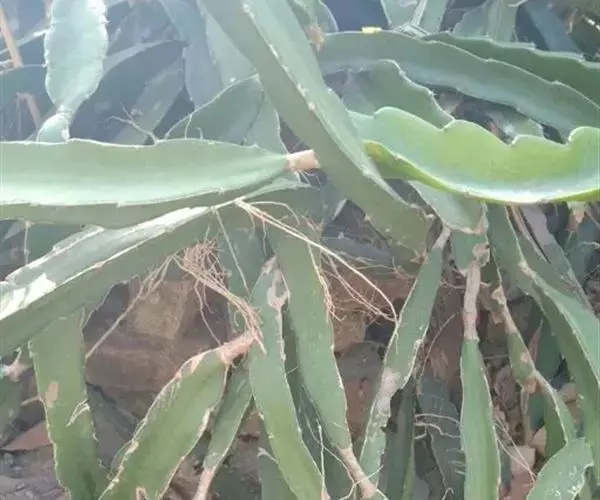 火龙果的气生根很多,可以转化为吸收根。进行扩穴改土,可逐渐扩宽根系分布;也可绑扎牵引诱导气生根下地。