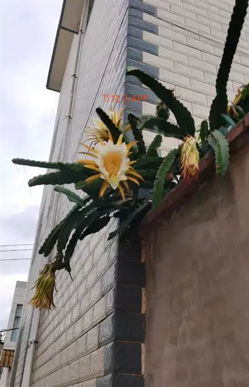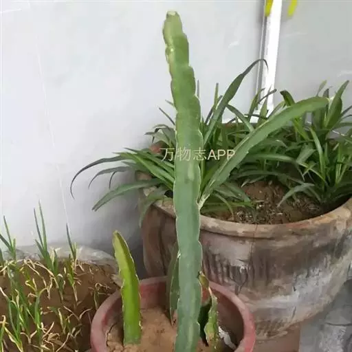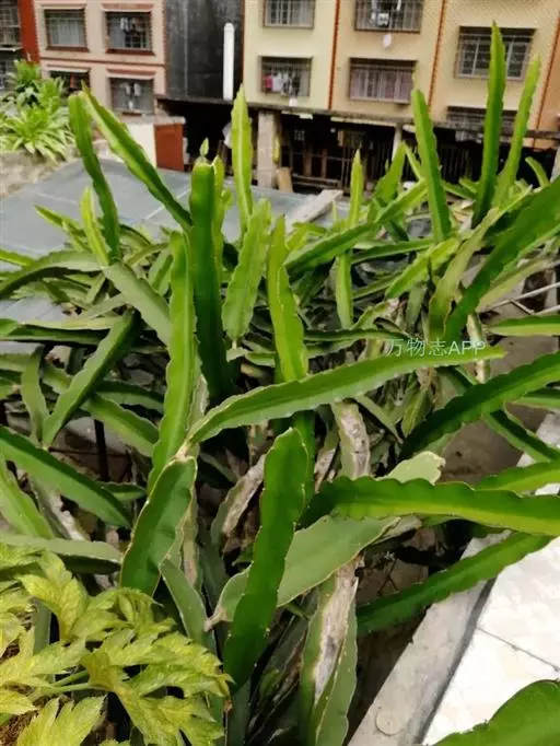 火龙果(学名:Hylocereus undatus 'Foo-Lon', 别名:红龙果、青龙果、仙蜜果、玉龙果)是仙人掌科、量天尺属量天尺的栽培品种,攀援肉质灌木,具气根。分枝多数,延伸,叶片棱常翅状,边缘波状或圆齿状,深绿色至淡蓝绿色,骨质;花漏斗状,于夜间开放;鳞片卵状披针形至披针形,萼状花被片黄绿色,线形至线状披针形,瓣状花被片白色,长圆状倒披针形,花丝黄白色,花柱黄白色,浆果红色,长球形,果脐小,果肉白色、红色。种子倒卵形,黑色,种脐小。7-12月开花结果。