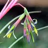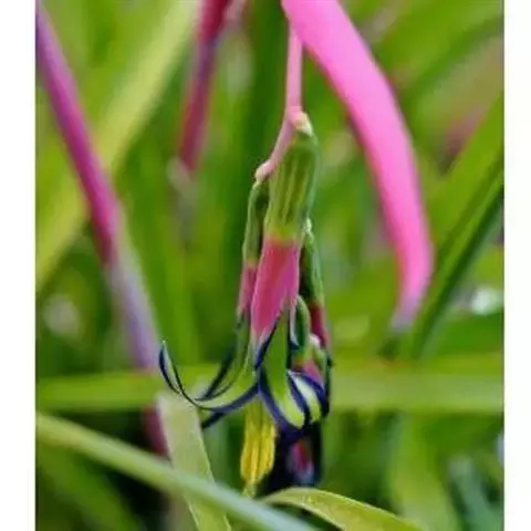 花序于叶丛中抽出,状如松球,长6-8厘米,结果时增大;苞片基部绿色,上半部淡红色,三角状卵形;萼片宽卵形,肉质,顶端带红色,长约1厘米;花瓣长椭圆形,端尖,长约2厘米,上部紫红色,下部白色;生于花序顶部的叶变小,常呈红色。基部鞘状,雨水沿叶面流入由叶鞘形成的贮水器中。花序顶生,圆锥花序。
