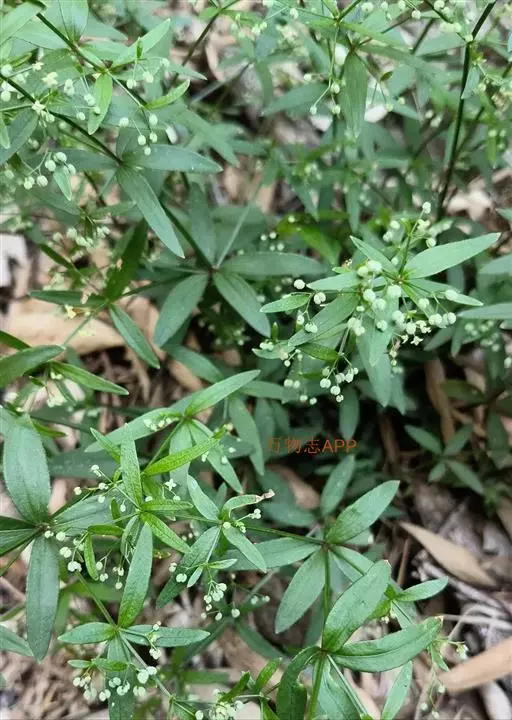 多年生丛生直立草本,高5-50厘米,有红色丝状根;茎有4棱,不分枝或稍分枝,常无毛或节上有微毛。叶纸质,4片轮生,叶形变化较大,常在同一株内上部与下部的叶形均不同,卵状长圆形、卵状披针形、披针状长圆形或线状披针形,长0.6-3.4厘米,宽2-6毫米,顶端尖或稍钝,基部楔形,中脉和边缘常有刺状硬毛,有时两面亦有糙伏毛,1脉,近无柄或有短柄。聚伞花序顶生和腋生,稠密或稍疏散,总花梗纤细,常3歧分枝,再形成圆锥状花序;花小;花梗纤细,长1-7毫米;花冠黄绿色或白色,辐状,直径1.4-2毫米,无毛,花冠裂片卵形或长圆形,长0.6-1毫米。果爿近球状,直径1-2毫米,通常双生,有小疣点、小鳞片或短钩毛,稀无毛;果柄纤细,常比果长,长可达9毫米。花期4-9月,果期5一翌年1月。