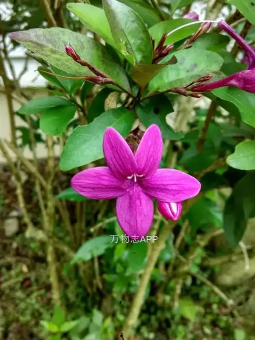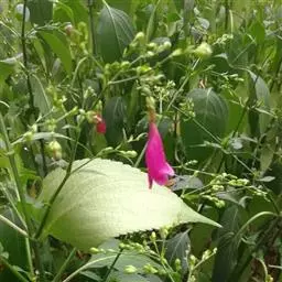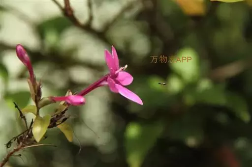 紫云杜鹃 又称大花钩粉草,紫云花。分类:爵床科。分布:斐济岛。常绿灌木,株高约20~50厘米,分枝较多。叶对生,长椭圆形或披针形,顶端渐尖,基部楔形,全缘。花长筒状,腋生,先端5裂 ,紫红色。花期夏、秋。