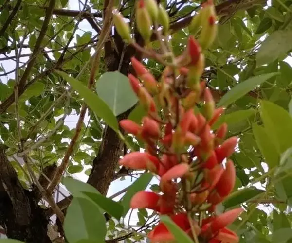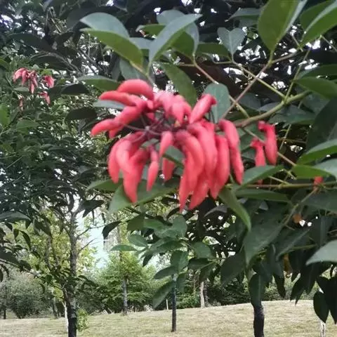 鸡冠刺桐盛花期时,其花序就好似一串熟透了的火红的辣椒。
