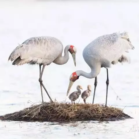 白头鹤是鹤类家族中行踪隐秘的成员,白头鹤4-5岁达到性成熟。一旦组成家庭,夫妻关系十分稳定。一般夫妻的年龄略有差异,雄性大于雌性一岁以上。它们几乎终年形影不离。每年4月初,带着上一年的幼鸟,从越冬地迁回到北方的老家——森林湿地。最让它们倾注精力的是:要用31天左右的时间来孵化两枚蛋宝宝。一般夫妻轮流孵卵,只是雌鸟更积极一些。无论是低温风雪、大雨倾盆,还烈日当空,它们始终尽职尽责地呵护着它们的未来。在孵卵过程中,有许多相互关爱的场面。每当换孵时,先是悄悄细语,巢上的值班者缓缓走下,并不断从身边拾取枯枝草叶添加到巢上,以示责任尚在、配偶并不孤独。继任者轻轻上巢,时而理羽、时而拨卵,显得轻松自在、信心十足。白头鹤国际援助(GMIA)负责人在举办各种活动时,不止一次地把白头鹤誉为“爱情鸟”,就连赠送友人的结婚纪念品都印上:“以鹤为媒、白头偕老”。