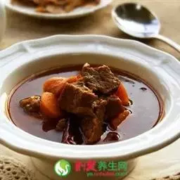 牛肉有滋补健身的作用,但牛肉纤维粗,有时会影响胃黏膜。与土豆、芹菜、葱头、白萝卜、红枣、口蘑搭配后,不但味道好,且弥补了牛肉的缺点。如土豆含有丰富的叶酸,起着保护胃黏膜的作用。芹菜清热利尿,有降胆固醇的作用。白萝卜富含多种维生素,有清热解毒、康胃健脾、止咳止痢及防治夜盲症、眼病、皮肤干燥等功效。洋葱具有祛风发汗、消食、治伤风、促进睡眠的作用。红枣有保肝、镇静、催眠、降压、抗过敏、抗癌、抗菌等作用。口蘑有补益肠胃、抗癌、防衰、延年益寿的功效。此菜的搭配对缺血、脾胃虚弱、营养不良者有一定的疗效。