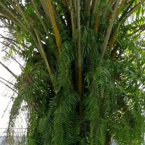 王棕,茎直立,乔木状,高10-20米;茎幼时基部膨大,老时近中部不规则地膨大,向上部渐狭。叶羽状全裂,弓形并常下垂,长约4-5米,叶轴每侧的羽片多达250片,羽片呈4列排列,线状披针形,渐尖,顶端浅2裂,长90-100厘米,宽3-5厘米,顶部羽片较短而狭,在中脉的每侧具粗壮的叶脉。