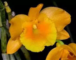 独角石斛,Dendrobium unicum,兰科石斛属植物。花瓣橙黄色,唇瓣反转似犀牛角,…