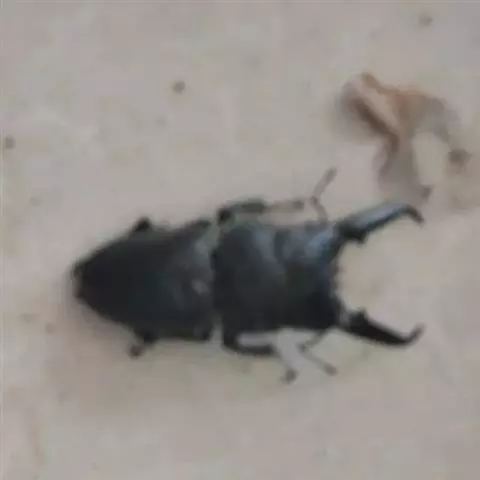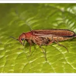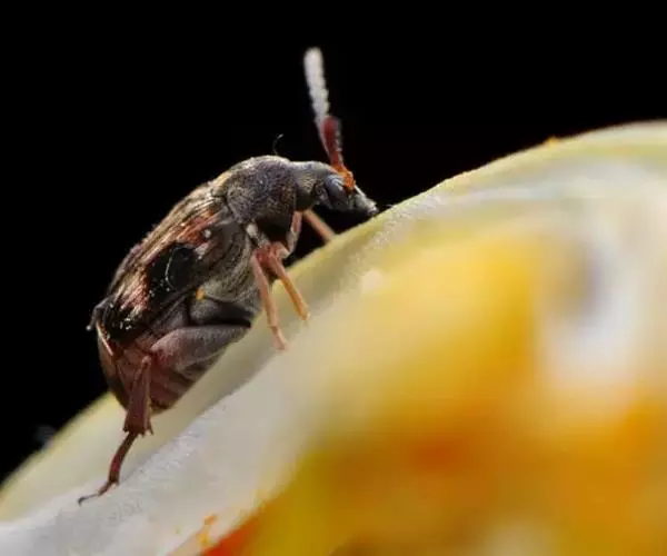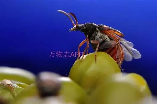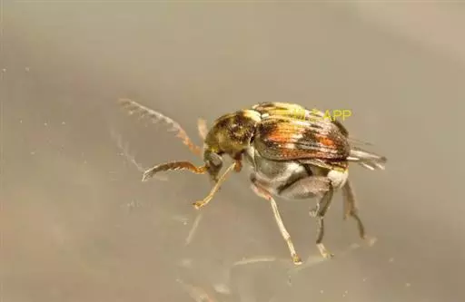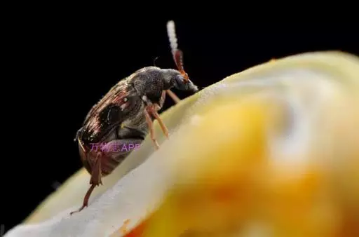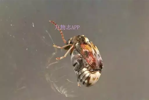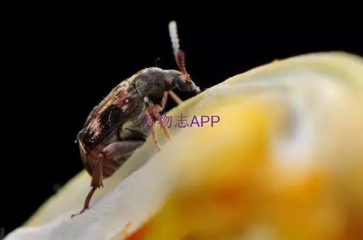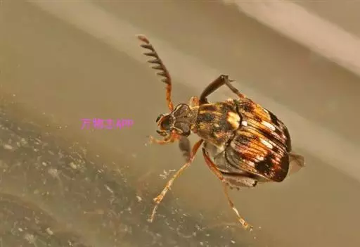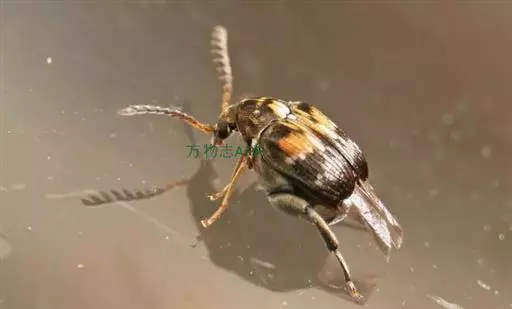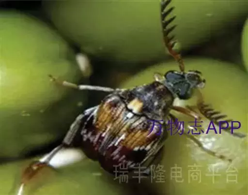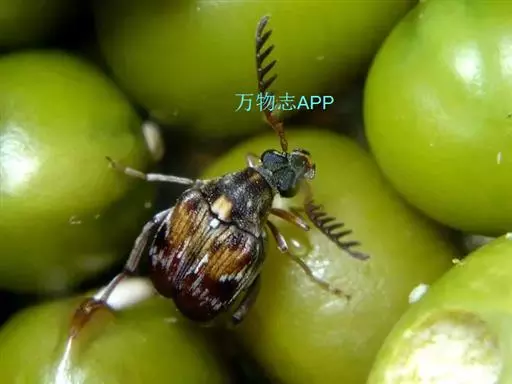 绿豆象 体长2—3.5mm,宽1.3—2mm,卵圆形,深褐色;头密布刻点,额部具一条纵脊,雄虫触角栉齿状,雌虫锯齿状;前胸背板后端宽,两侧向前部倾斜,前端窄,着生刻点和黄褐、灰白色毛,后缘中叶有1对被白色毛的瘤状突起,中部两侧各有一个灰白色毛斑。小盾片被有灰白色毛。鞘翅基部宽于前胸背板,小刻点密,灰白色毛与黄褐色毛组成斑纹,中部前后有向外倾斜的2条纹。臀板被灰白色毛,近中部与端部两侧有4个褐色斑。后足腿节端部内缘有一个长而直的齿,外端有一个端齿,后足胫节腹面端部有尖的内、外齿各一个。