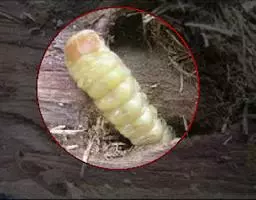 密布小刻点,有灰白色与黄褐色交杂组成的毛斑。臀板向下垂直,覆白色毛,近中部与端部两侧有褐色斑 4个。后足腿节内缘端部有长而直的齿1个,外缘端部有齿1个;后胫节腹面端部有尖的内齿与外齿各1个。幼虫体肥大,弯曲,呈乳白色。1龄幼虫前胸背板有齿,脱皮后即消失。