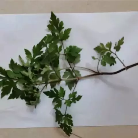 叶对生,具柄,柄长2-3厘米,背面微凸或扁平,腹面有沟槽,槽内及边缘有疏柔毛,叶片长6-10厘米,2-3回羽状分裂,第一次分裂深达中肋,裂片再次羽状分裂,小裂片具1-2个粗齿或再作第三回羽裂,最后一次裂片条形或条状披针形,宽约2毫米,先端锐尖,边缘稍向上反卷,上面被短柔毛,下面无毛或沿叶脉被稀疏柔毛,上部叶互生,二回或一回羽状分裂。
