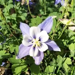 大花耧斗菜(Aquilegia glandulosa Fisch. ex Link.),属双子叶植物纲 、毛茛目、毛茛科植物,高20-40厘米,叶片轮廓三角形,苞片披针形至长圆形,花瓣瓣片蓝色或白色,近直立,圆状卵形,蓇葖长2-3厘米,顶端宿存花柱长6-7毫米。6-8月开花。喜生于海拔1900-2700米间的山地针叶林下,山坡草地或谷地河
