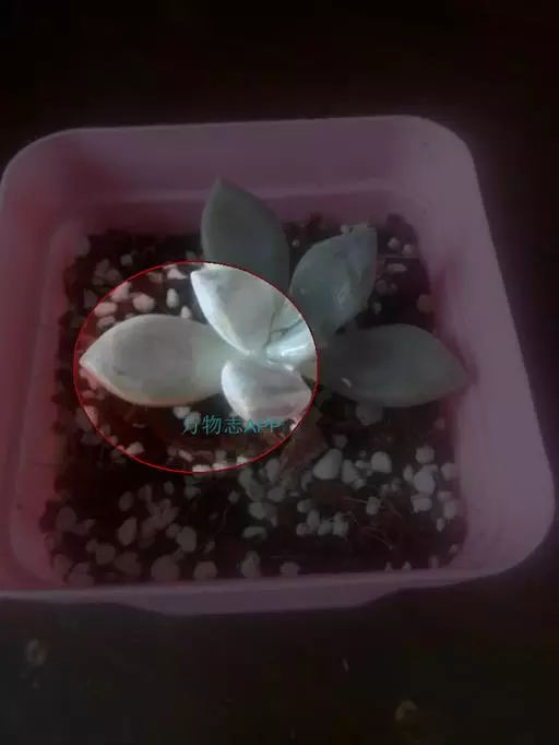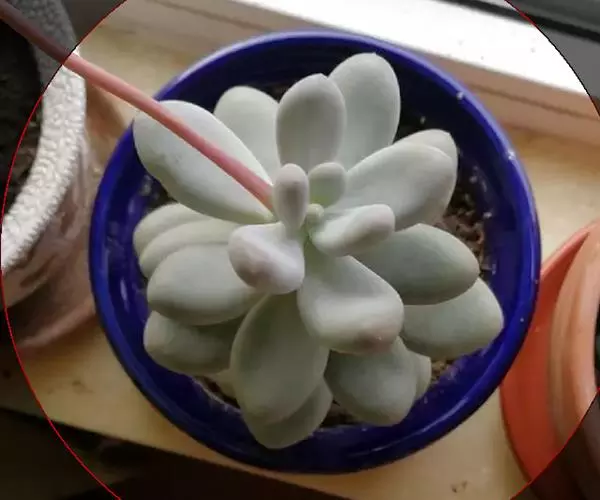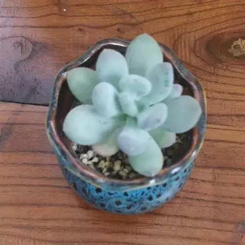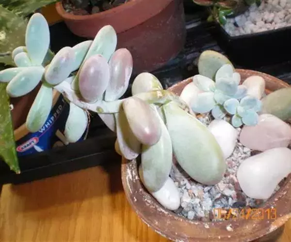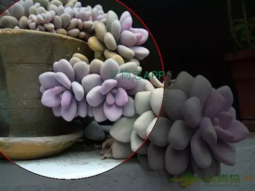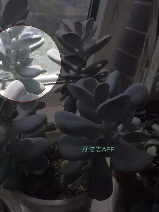 肉质叶互生,呈延长的莲座状排列,倒卵形至倒卵状椭圆形,长3~5厘米,宽1.8~3厘米,厚约0.8~1.7厘米,先端圆钝,表面平滑,叶色从泛蓝的灰绿色至淡紫色不等,被有浓厚的白粉。