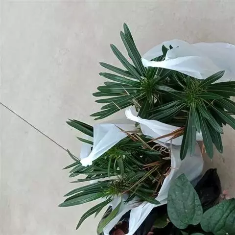 扦插成活后的幼苗基部的节距较大,叶片较小;但是生长茁壮后则枝顶的叶片变得肥大、节距变小、整体感觉头重脚轻,为了提高观赏效果可以进行整型。方法是将植株顶端(感觉偏重部分)剪断。母株去顶就是去掉顶端优势,使之萌发新的侧枝,侧枝长壮后可形成多干的植株,而且株形优美,提高了观赏效果。