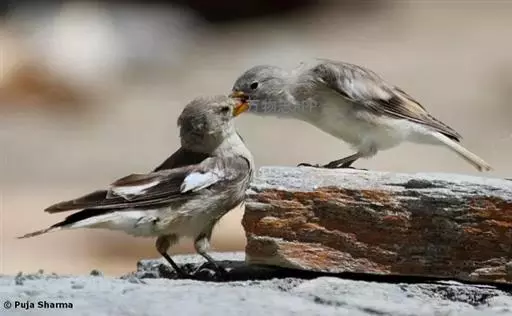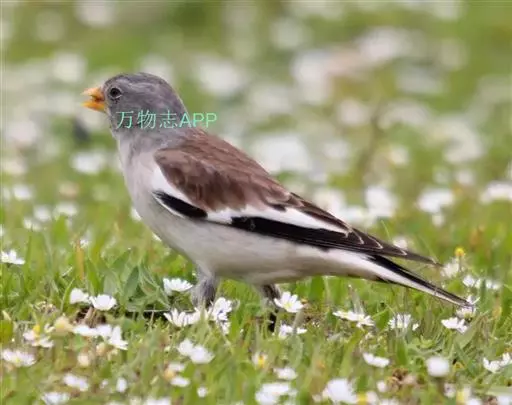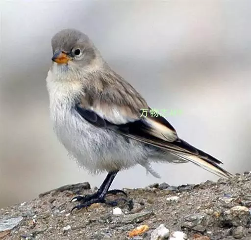 白斑翅雪雀(学名:Montifringillla nivalis):属典型的高原鸟类,共有7个亚种,体重30-34克,体长142-169毫米,较雪雀属中其他种体型稍大;雄鸟头灰,颏黑,翕和肩富于褐色;翼大部白色;除一对中央尾羽黑色外其余均为白色而具黑色羽端,飞行时尾部呈中间黑、两边白的形态。雌鸟像雄鸟,但中覆羽底色常显暗色。初级飞羽9枚,外侧飞羽的淡色羽缘(第一枚除外)在羽基和近端处,形稍扩大,互相骈缀,略成两道横斑状,在飞翔时尤见明显。嘴短粗而强壮,呈圆锥状,嘴峰稍曲。