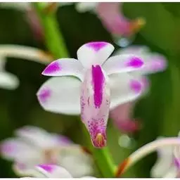 盆距兰 D.Don):茎长5-30厘米,粗5-8毫米,常弧形弯曲,具多数叶。叶二列互生,稍肉质,…