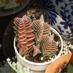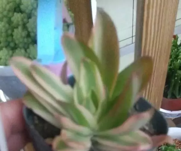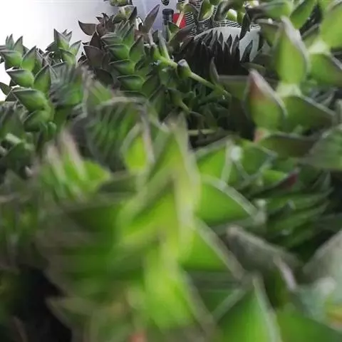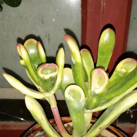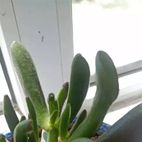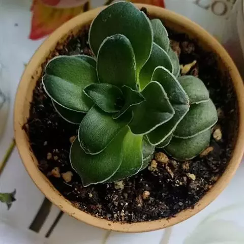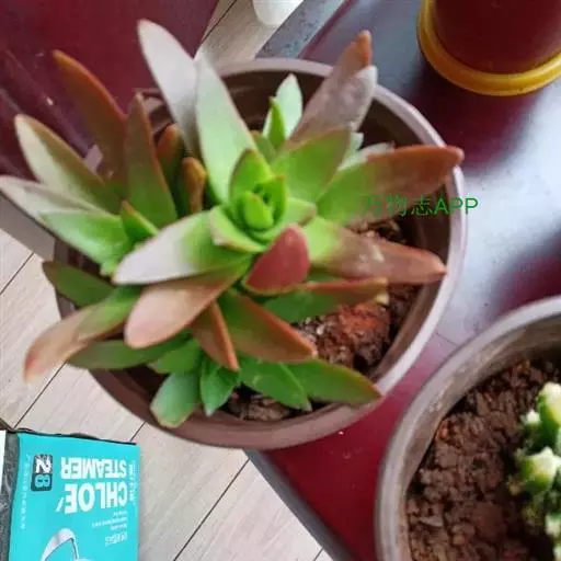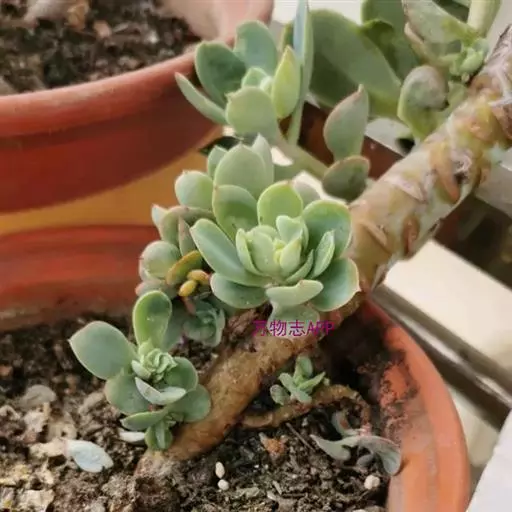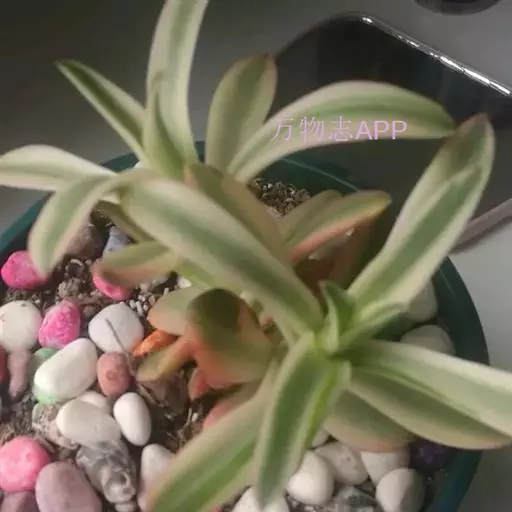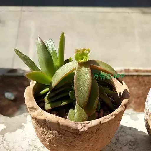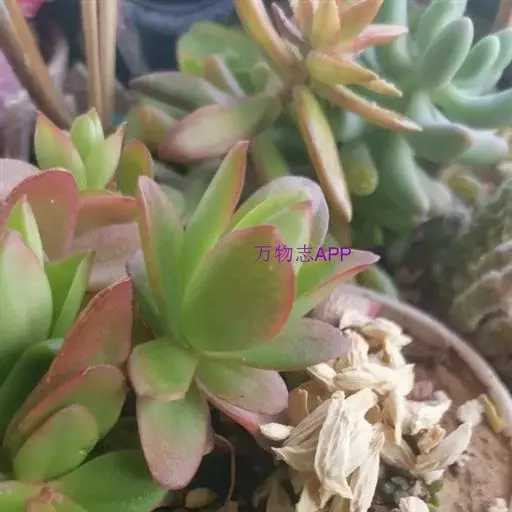 多肉植物,植株丛生,长圆形肉质叶交互对生,排列紧密,使植株呈四棱状,叶面有毛点,在光 照充足的条件下肉质叶呈浅绿色至深红色,特别是秋末至春季,由于此时昼夜温差较大且阳光充足,叶色更为鲜艳。聚伞花序,小花黄白色。