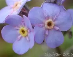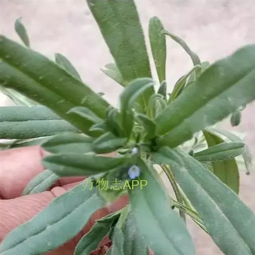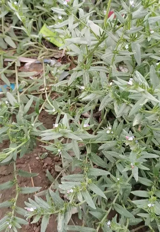 一年生草本。根稍含紫色物质。茎通常单一,高15-35厘米,自基部或仅上部分枝有短糙伏毛。叶无柄,倒披针形至线形,长2-4厘米,宽3-7毫米,先端急尖,两面均有短糙伏毛。聚伞花序生枝上部,长可达10厘米,苞片与叶同形而较小;花序排列稀疏,有短花梗;花萼裂片线形,长4-5.5毫米,通常直立,两面均有短伏毛,果期长可达11毫米且基部稍硬化;花冠高脚碟状,白色,有时蓝色或淡蓝色,筒部长约4毫米,外面稍有毛,檐部长约为筒部的一半,裂片卵形或长圆形,直立或稍开展,长约1.5毫米,稍不等大,喉部无附属物,但有5条延伸到筒部的毛带;雄蕊着生花冠筒下部,花药长约1毫米;花柱长1.5-2毫米,柱头头状。小坚果三角状卵球形,长约3毫米,灰褐色,有疣状突起。花果期4-8月。