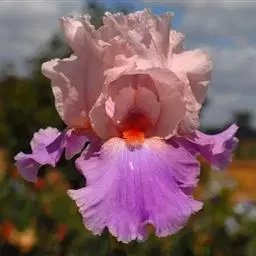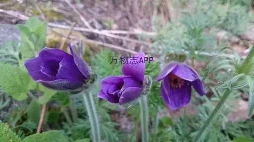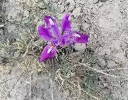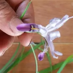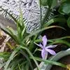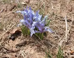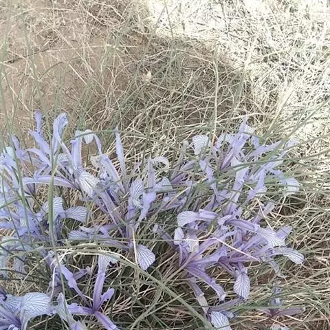 花茎甚短,不伸出地面;花1-2朵,淡蓝色、红紫色或白色,有香味,直径2.5-3厘米;花被裂片6,2轮排列,内、外轮花被裂片皆为倒卵形,顶端钝,长4-5厘米;雄蕊直立,长2.5厘米,花药黄色,顶端尖,略弯曲;花柱橙红色,长约4厘米,上部3分枝,分枝弯曲而下垂,柱头略扁,顶端楔形,有浅齿,较雄蕊长,子房狭纺锤形。蒴果椭圆形,长约3厘米。