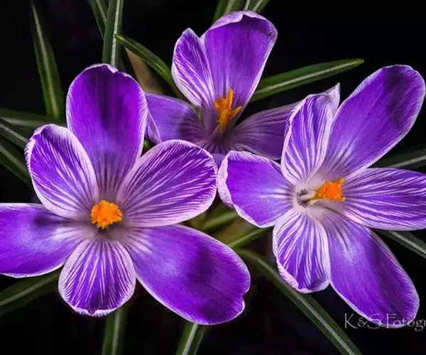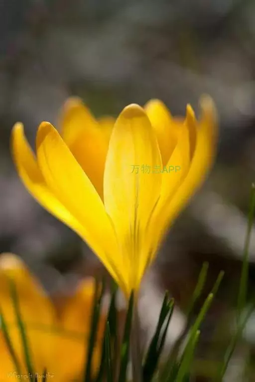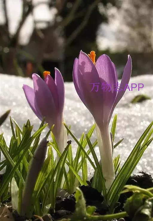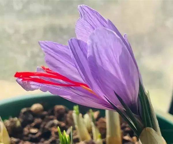 番红花是多年生草本植物。球茎扁圆球形,直径约3厘米,外有黄褐色的膜质包被。叶基生,9-15枚,条形,灰绿色,长15-20 厘米,宽2-3毫米,边缘反卷;叶丛基部包有4-5片膜质的鞘状叶。