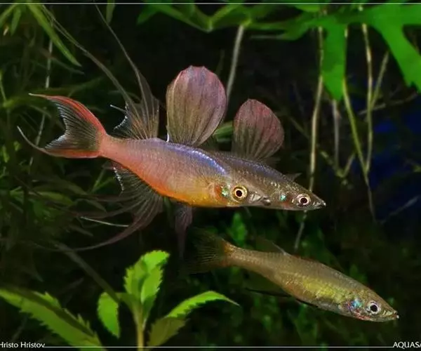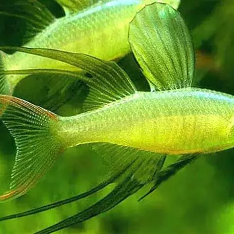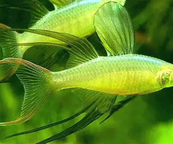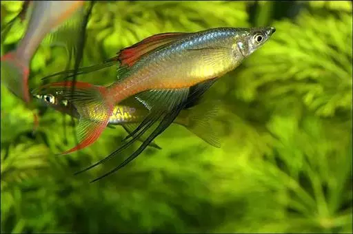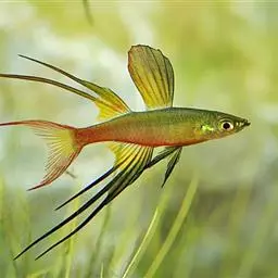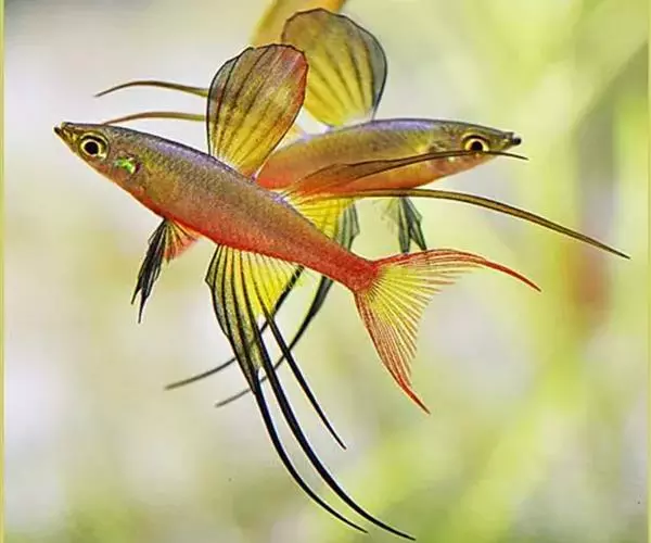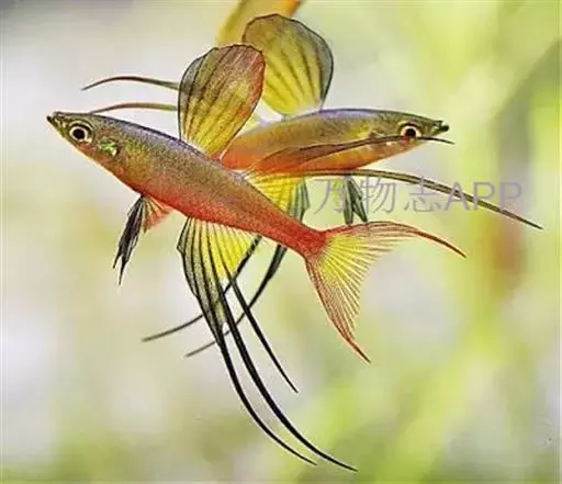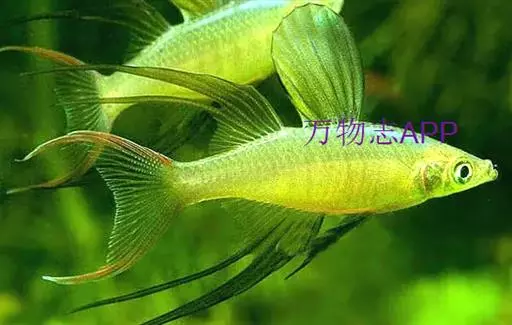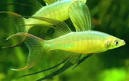 身体为尖梭形,腹部圆,尾柄长。体背部青色,腹部金黄色,体侧中央从眼晴到尾柄方向一条金黄色带。背 鳍挺拔修长,鳍条末梢尖长,向后廷伸起过尾鳍。腹鳍变异为两根长长的尖鳍,形似燕子。