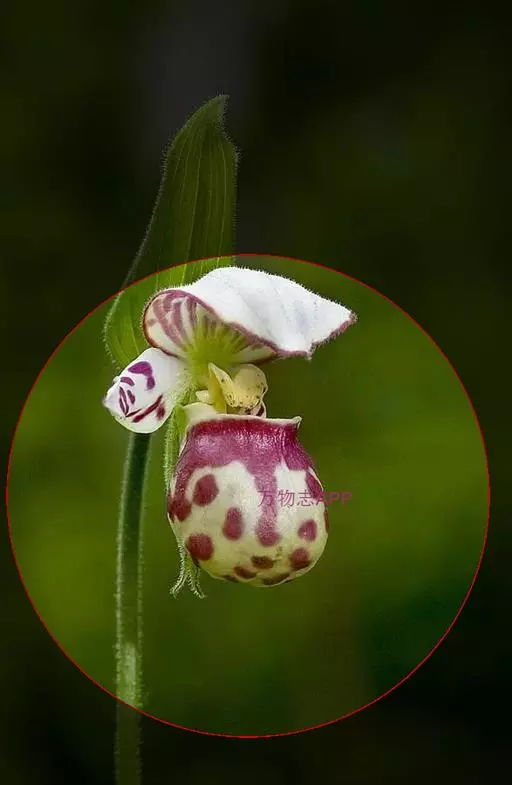 花序顶生,具1花;花序柄密被短柔毛和腺毛;花苞片叶状,卵状披针形,通常长1.5-3厘米,先端急尖或渐尖,边缘具细缘毛;花梗和子房长1-1.5厘米,被腺毛;花白色,具淡紫红色或淡褐红色斑;中萼片卵状椭圆形或宽卵状椭圆形,长1.5-2.2厘米,宽1.2-1.6厘米,先端急尖或短渐尖,背面基部常疏被微柔毛;合萼片狭椭圆形,长1.2-1.8厘米,宽5-6毫米,先端2浅裂。