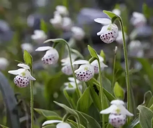 紫点杓兰(学名:Cypripedium guttatum Sw.)是兰科、杓兰属的国家一级保护植物。植株高15-25厘米,具细长而横走的根状茎。茎直立,被短柔毛和腺毛,基部具数枚鞘,顶端具叶。叶2枚;叶片椭圆形、卵形或卵状披针形,长5-12厘米,宽2.5-4.5厘米。花序顶生,具1花;花白色,具淡紫红色或淡褐红色斑;中萼片卵状椭圆形或宽卵状椭圆形,花瓣常近匙形或提琴形,唇瓣深囊状,钵形或深碗状,多少近球形。蒴果近狭椭圆形,下垂,被微柔毛。花期5-7月,果期8-9月。
