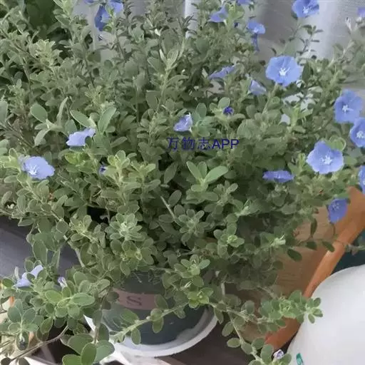 叶: 叶互生,长椭圆形,全缘,叶背密被白毛。 茎:株高30~60公分。茎半蔓性,密被白毛。 花:花为腋生,合瓣花,花冠五裂蓝色,中心白星形。全年均能开花。