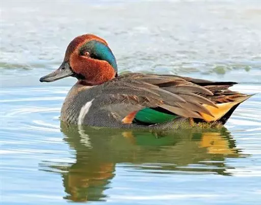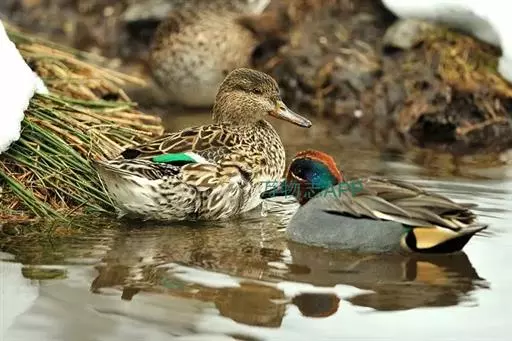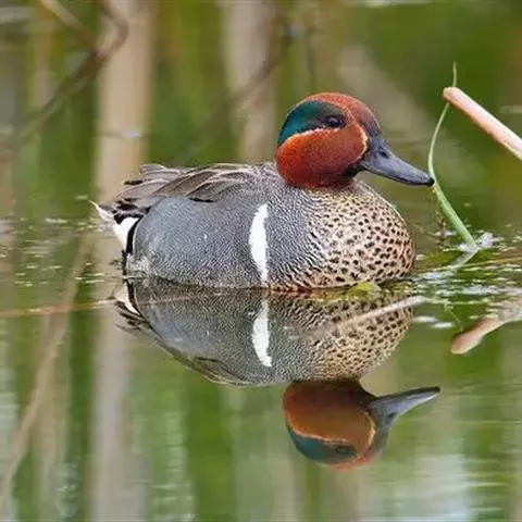 绿翅鸭(学名:Anas crecca)是小型鸭类,体长37厘米,体重约0.5千克。嘴脚均为黑色。雄鸟头至颈部深栗色,头顶两侧从眼开始有一条宽阔的绿色带斑一直延伸至颈侧,尾下覆羽黑色,两侧各有一黄色三角形斑,在水中游泳时,极为醒目。飞翔时,雌雄鸭翅上具有金属光泽的翠绿色翼镜和翼镜前后缘的白边,亦非常醒目。跗鳞盾片状;雄体气管有不对称的膨大部;两者鸣声不同,通常羽衣及行为亦异;配偶关系及家庭生活维持时间短;一年换羽2次;雄体常换“蚀羽”及鲜艳的婚羽各1次;幼雏的绒羽有明显花纹;雌体有“逗引”表演。广泛分布于美洲、欧洲、亚洲和非洲等地。