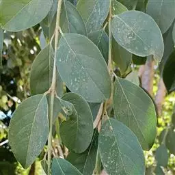 叶片革质,披针形,有时为长圆状椭圆形或卵形,长1.5-6厘米,宽0.5-1.5厘米,先端锐尖至渐尖,具小凸尖,基部渐窄或楔形,全缘,叶缘反卷,上面深绿色,稍被银灰色鳞片,下面浅绿色,密被银灰色鳞片,两面无毛,中脉在两面凸起或上面微凹入,侧脉不甚明显,5-11对,在上面微凸起;叶柄长2-5毫米,密被银灰色鳞片,两侧下延于茎上成狭棱,上面具浅沟。