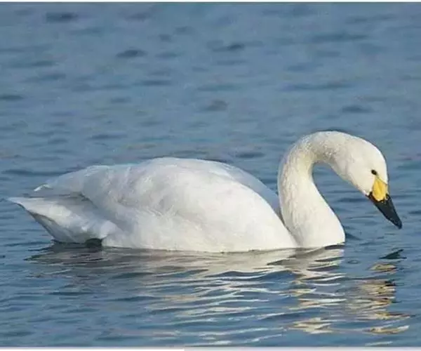 小天鹅(学名:Cygnus columbianus)为大型水禽,体长110~130厘米,体重4~7千克,雌鸟略小。它与大天鹅在体形上非常相似,同样是长长的脖颈,纯白的羽毛,黑色的脚和蹼,身体也只是稍稍小一些,颈部和嘴比大天鹅略短,但很难分辩。最容易区分它们的方法是比较嘴基部的黄颜色的大小,大天鹅嘴基的黄色延伸到鼻孔以下,而小天鹅黄色仅限于嘴基的两侧,沿嘴缘不延伸到鼻孔以下。它的头顶至枕部常略沾有棕黄色,虹膜为棕色,嘴端为黑色。它的鸣声清脆,有似“叩,叩”的哨声,而不像大天鹅的象喇叭一样的叫声。