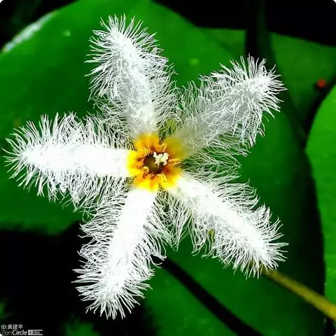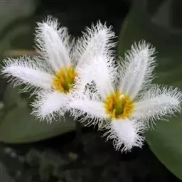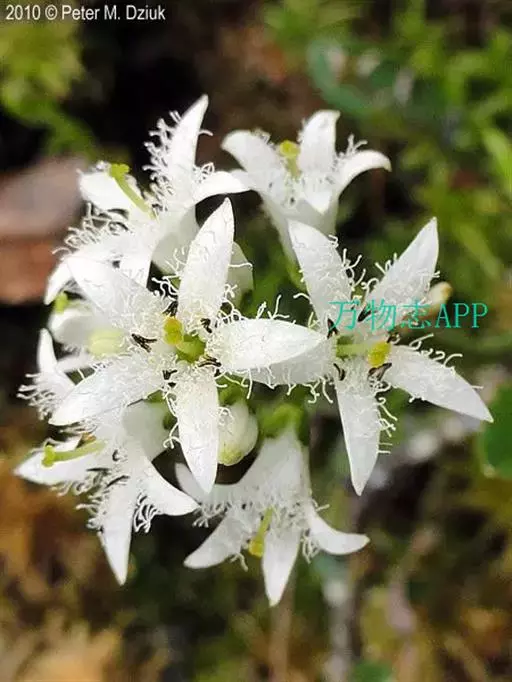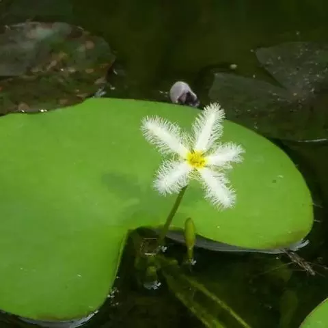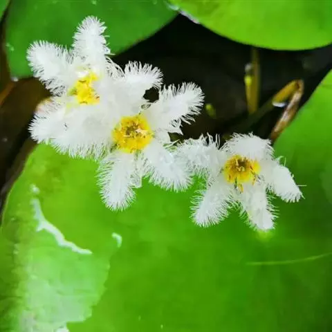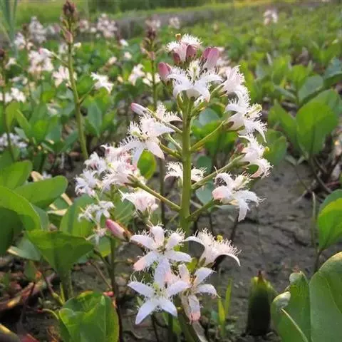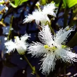 睡菜(学名:Menyanthes trifoliata L.)整株挺水植物,全株光滑无毛。根状茎匍匐状,叶基生,三出复叶、椭圆形,总柄长23-30厘米,全缘状微波形。总状花序顶生,基部生一披针形苞叶。小花具柄,直径1-2厘米;花冠5深裂,白色,有纤毛;雄蕊5枚,红色;子房上位,蒴果球形。花期5-7月,果期6-8月。