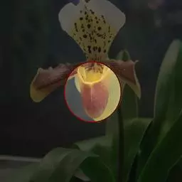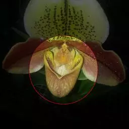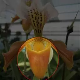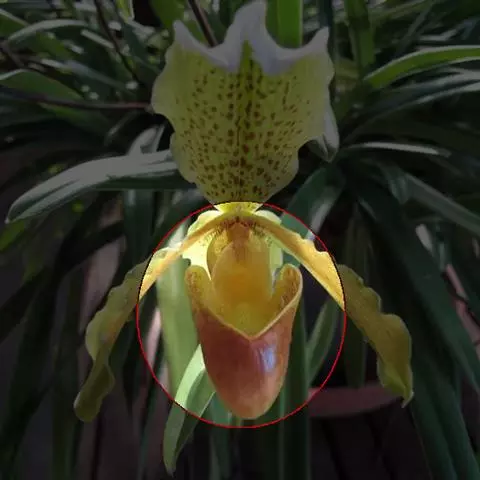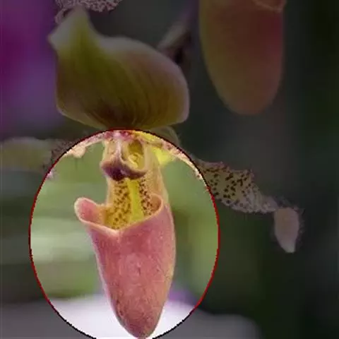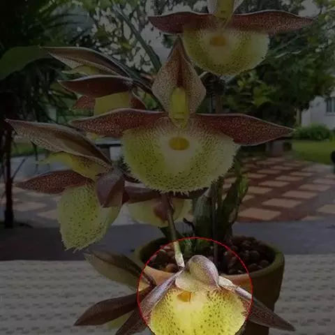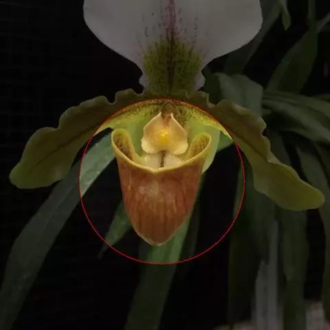 花葶直立,长8-16厘米,有紫褐色斑点,密被短柔毛,顶端生1花;花苞片绿色,宽卵形,围抱子房,长1.5-1.9(-2.8)厘米,宽1.1-1.3厘米,背面下半部疏被短柔毛或仅基部有毛;花梗和子房长2.6-5.5厘米,密被短柔毛;花中等大;中萼片中央黄绿色至黄褐色,上端与边缘白色,合萼片与中萼片同色但无白色边缘,花瓣边缘奶油黄色至淡黄绿色,中央有密集的褐色脉纹或整个呈褐色,唇瓣浅红褐色;中萼片近圆形或宽卵形,长2.8-3.2厘米,宽2.2-2.7(-4)厘米,先端钝,基部有短柄,背面被短柔毛;合萼片明显小于中萼片,卵形或卵状椭圆形,长2.3-2.5厘米,宽1.2-1.5厘米,先端钝或浑圆,背面亦被毛;花瓣狭长圆形或略带匙形,长3-4厘米,宽约1厘米,边缘波状,先端钝,基部疏被长柔毛;唇瓣倒盔状,基部具宽阔的、长1.5-2厘米的柄;囊近卵形,长2-2.5厘米,宽1.5-2厘米,囊口极宽阔,两侧各具1个直立的耳,两耳前方的边缘不内折,囊底有毛;退化雄蕊宽倒卵形,长6-7毫米,宽7-8毫米,基部略有耳,上面中央具1个脐状突起。花期10-12月。
