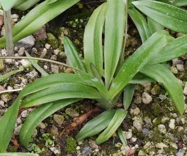 叶基生,二列,5-6枚;叶片宽线形,长8-19厘米,宽7-18毫米,先端略钝或有时具2小齿,基部收狭成叶柄状并对折而互相套叠,无毛或近基部边缘略有缘毛。