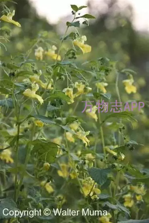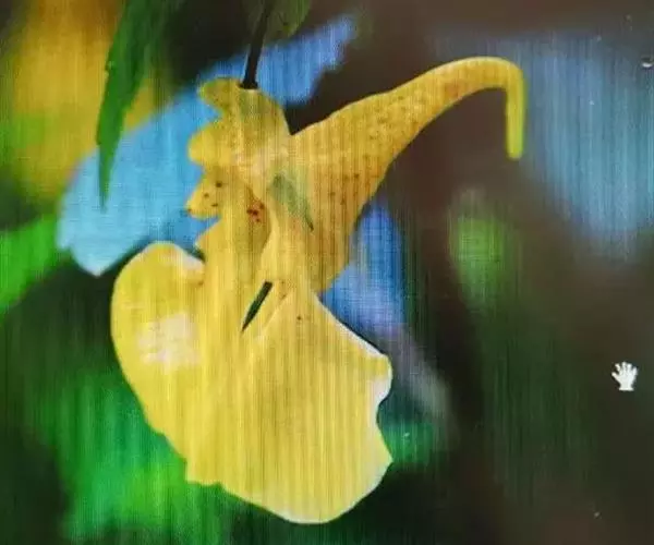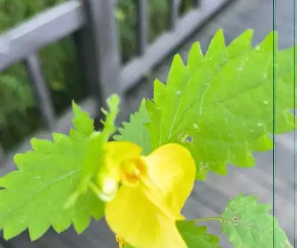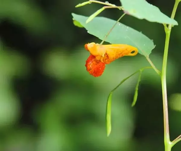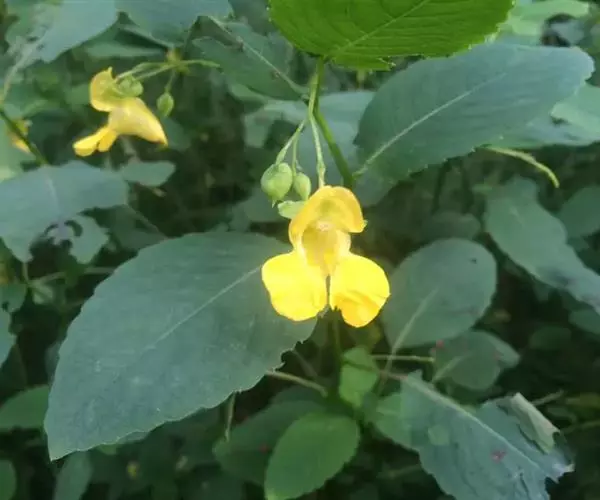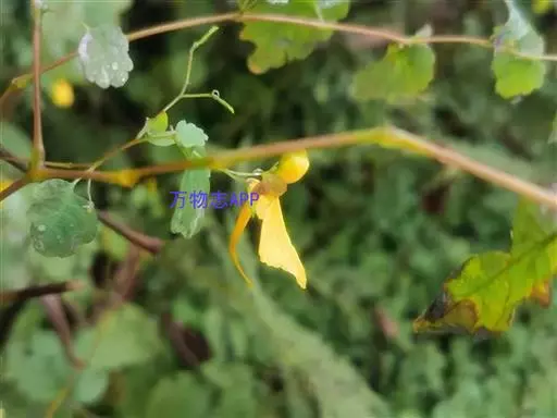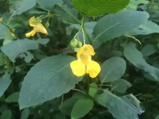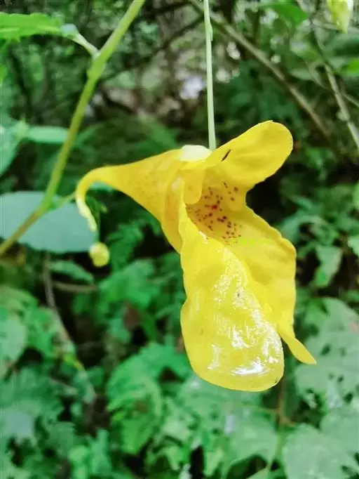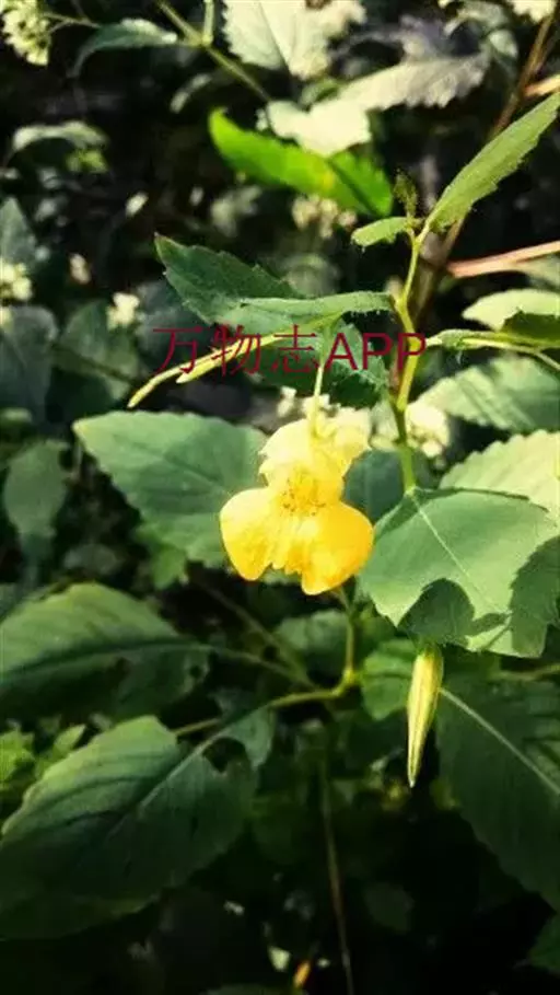 水金凤(学名:Impatiens noli-tangere Linn.):是凤仙花科,凤仙花属一年生草本植物,高可达70厘米。茎肉质,直立,叶互生;叶片卵形或卵状椭圆形,边缘有粗圆齿状齿,上面深绿色,下面灰绿色;叶柄纤细,总状花序;苞片草质,披针形,花黄色;侧生萼片卵形或宽卵形,旗瓣圆形或近圆形,翼瓣无柄,唇瓣宽漏斗状,花丝线形,花药卵球形,顶端尖;子房纺锤形,蒴果线状圆柱形,种子多数,7-9月开花。
