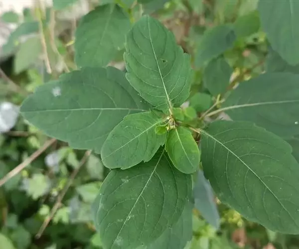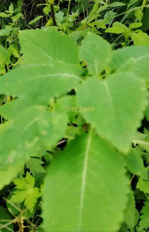 叶互生;叶片卵形或卵状椭圆形,长3-8厘米,宽1.5-4厘米,先端钝,稀急尖,基部圆钝或宽楔形,边缘有粗圆齿状齿,齿端具小尖,两面无毛,上面深绿色,下面灰绿色;叶柄纤细,长2-5厘米。最上部的叶柄更短或近无柄。