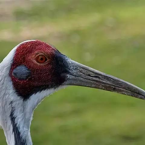白枕鹤又叫红脸鹤、红面鹤,是大型涉禽。虹膜暗褐色,嘴黄绿色,脚红色。前额、头顶前部、眼先、头的侧部以及眼睛周围的皮肤裸出,均为鲜红色,其上着生有稀疏的黑色绒毛状羽。耳羽为烟灰色。头顶的后部、枕部、后颈、颈侧和前颈的上部形成一条暗灰色条纹,颊部和喉部为白色。颈侧和前颈的下部以及下体呈暗石板灰色。上体为石板灰色。尾羽为暗灰色,末端具有宽阔的黑色横斑。翅膀上的初级飞羽为黑褐色,具有白色的羽干纹,次级飞羽也是黑褐色,基部白色,三级飞羽为淡灰白色,延长成弓状,翅膀上的覆羽为灰白色,初级覆羽黑色,末端白色。三国吴陆玑《毛诗陆疏广要》说