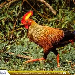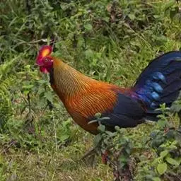 黑尾原鸡:雄鸟体型较大,体羽艳丽且金属光泽;脸部裸皮、有红色肉冠及肉垂,大而显著;中央两枚尾羽延长…
