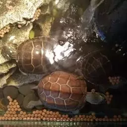每年的谷雨前后,眼斑水龟从冬眠中苏醒开始活动,温度达到18℃开始摄食,26-31℃时其食欲最旺盛。10月中下旬,随着气温下降,其食欲开始下降,直到冬眠停止。眼斑水龟的饵料有小鱼、小虾、螺肉、屠宰下脚料、谷、麦、瓜果及各种蔬菜等。春秋两季中午活动旺盛,应于此时投食饲喂;夏季则中午不爱活动,以上午和下午活动最多,可于上午9时、下午5时投料恫喂,投喂量可占体重的15%左右,可将饵料投于池边斜坡上或设计的投食台上。投喂饵料要求保证质量,动、植物饵料的配比为7:3或8:2,毎料要求新鲜,当天加工当天投喂,不投喂腐烂变质的食物。佴料较大时要用刀剁碎或用机械绞碎,以便其采食和增强适口性;春秋季每5天换水1次,在炎热高温夏季,每2天换水1次,以保水质新鲜。