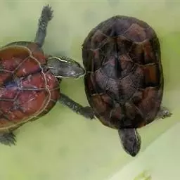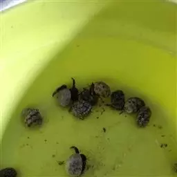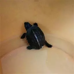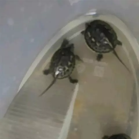 刚破壳孵出的幼龟,待脐带干脱收敛后用1%生理盐水消毒,然后置于水温25-30℃的水箱内,每天换水2-3次,2-3天后恫吸煮熟的麦就、鸡蛋南瓜、米等混合物,或喂切碎的鱼、蚌、肉、动物内脏和居宰下脚料,每天下午15-17时投喂。约50天后,每天上午8时、下午17时各喂1次,投喂量以少有剩余为宜,并及时清除残料,以防败坏水质。冬季幼龟要注意保暖,使之安全越冬,当水温15℃以下时,可用塑料薄膜。