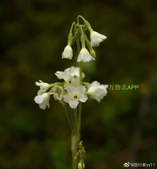 花葶高15-90厘米,顶端微被粉;伞形花序通常2-4轮,每轮5至多花;苞片窄披针形或矩圆形以至卵形,长6-20毫米,宽1.5-5 (8)毫米,绿色或带红褐色,通常被粉;花梗长1-8厘米,被淡黄色粉;花萼钟状或窄钟状,长7-10毫米,具5脉,外面被小腺体和稀薄黄粉,内面密被黄粉,分裂达全长的1/4-1/3,裂片三角形至披针形,先端锐尖,微向外反;花冠黄色、紫色或白色,冠筒长11-13毫米,筒口周围被黄粉,冠檐直径1.2-3厘米,裂片阔倒卵形至近圆形,先端具凹缺;长花柱花:雄蕊距冠筒基部约3毫米着生,花柱长达冠筒口;短花柱花:雄蕊近冠筒口着生,花柱长约2毫米。