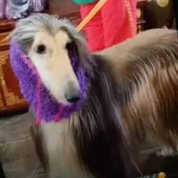 阿富汗猎犬全身披丝绢状的长毛,毛色鲜艳,呈多种颜色,背中线附近毛短,…