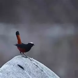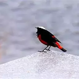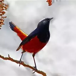 红头咬鹃多单个或成对活动;树栖性,或攀于小乔木的顶枝间啄食野果,或静立于树桠上俟机突袭飞过的昆虫,偶尔也尾随着飞虫而去,飞行力较差,虽快而不远,叫声有点像支离的猫叫声,一般似“shiu”的3声断续,从容不迫地发出,大概1分钟叫5、6次,冲击捕虫时或惊恐时也常发出似“krak”的单噪声,但平时甚静,不但栖止时不爱叫,来来去去也甚寂静。性胆怯而孤僻,常一动不动的垂直的站在树冠层低枝上或藤条上。飞行时多在林间呈上下起伏的波浪式飞行。