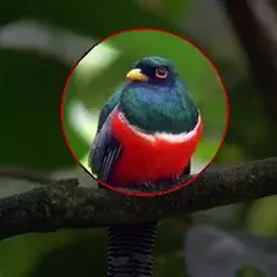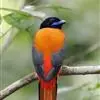红头咬鹃(学名:Harpactes erythrocephalus): 体大,体长约33厘米,体重75-110克。头、颈暗绯红色;背、肩锈褐色。两翅黑色,翅上覆羽和内侧飞羽密被白色细虫蠹斑纹,初级飞羽黑色,外侧具白色羽缘;腰和尾上覆羽较多锈色。中央尾羽深栗色,具黑色羽干纹和端斑。雄鸟以红色的头部为特征,背部颈圈缺失,红色的胸部上具狭窄的半月形白环;雌鸟与其他雌咬鹃区别在腹部红色,胸部具半月形白环;而与所有雄咬鹃的区别在头黄褐色。虹膜褐色;眼周裸皮蓝色;嘴近蓝色;脚偏粉色。